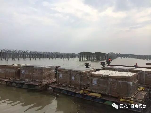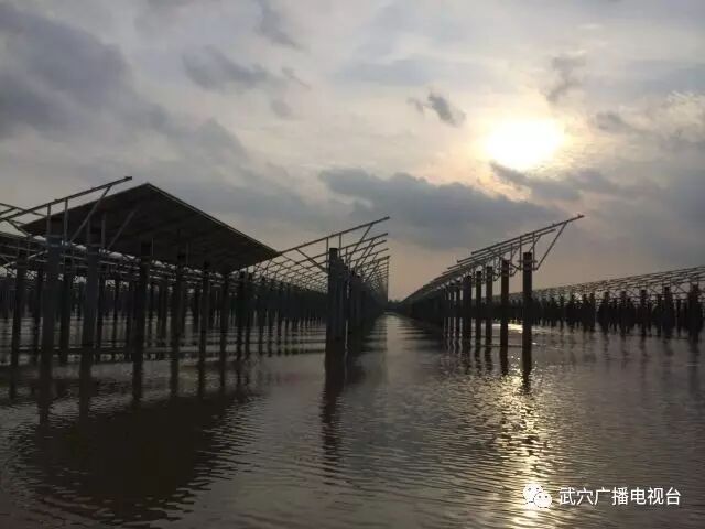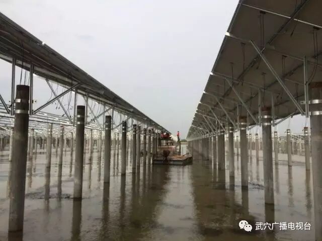 经过两个多月的施工,整个赤矶湖湖面上已经打下了3万根8米长的特制水泥桩,工人师傅们正在将光伏组件安装在水泥桩上,这样可以保证湖里正常养鱼,而电池板则可以变光为电。