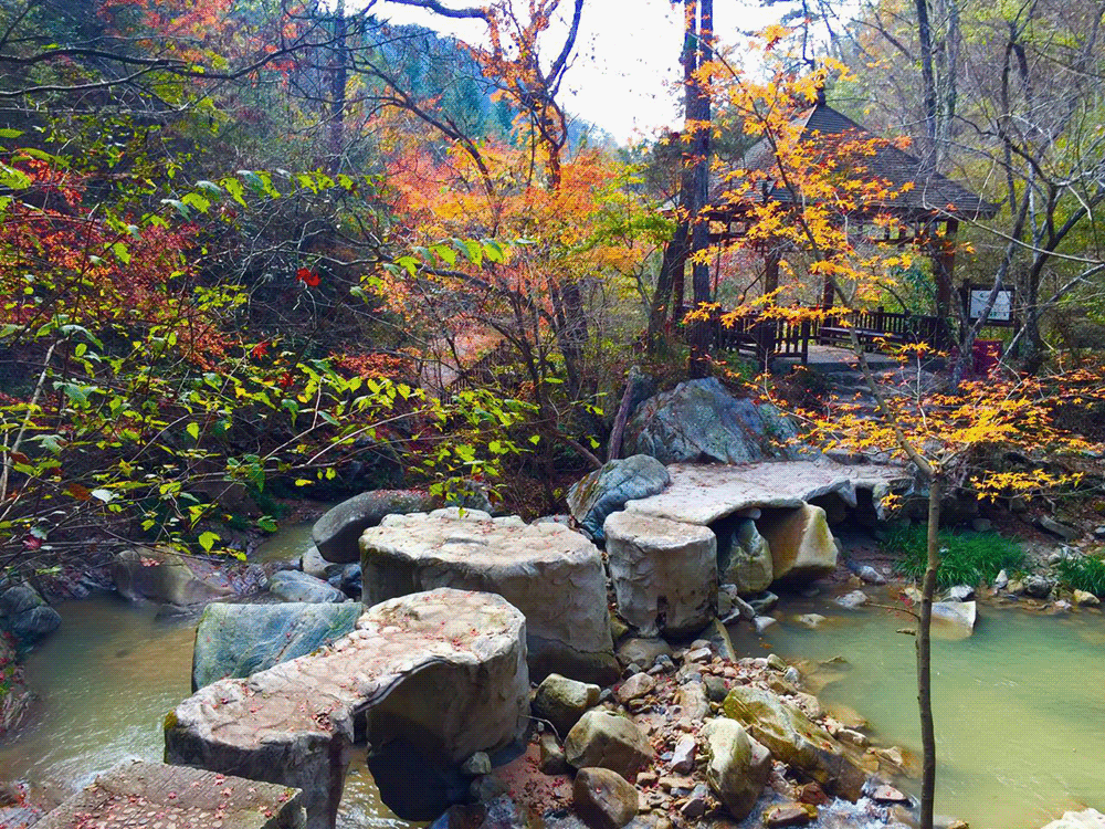 坐上索道,随着高度的上升,眼里的景色浓艳斑斓了起来。绿色的松,黄色的叶,红色的枫,在脚上变幻着色彩,时浓时淡,时疏时密,构成了一幅绝美的山水画卷,举起手机,随意截取就是一幅漂亮的画面。随着高度的上升,有声音从远处渐渐地传来,猛一听,以为是欧阳修《秋声赋》里的秋声,向下一望,原来是山上的溪水汇成了一股一股的瀑布,飞溅而下,在山坡上发出的鸣叫。非常庆幸,坐上了索道,才能把如此的美景尽收眼底,假如徒步而上,不但累的要死,还因了身在景中,反而看不到景色的壮丽。下了索道,本想沿着上山的游步道,一直登上大别山的顶峰,可因时间关系只好作罢!