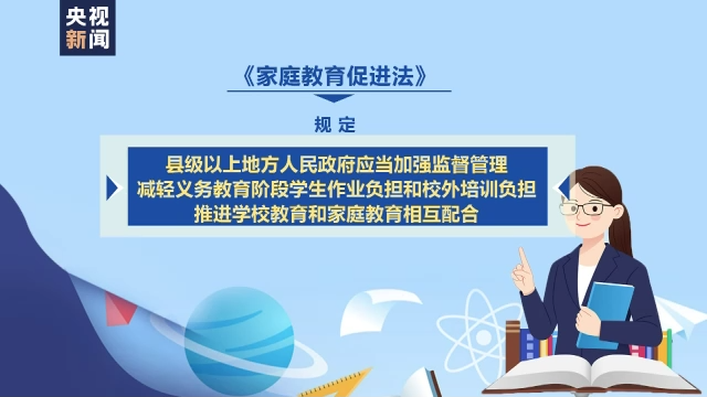2021年7月,中办、国办印发《关于进一步减轻义务教育阶段学生作业负担和校外培训负担的意见》,在“双减”背景下出台的家庭教育促进法自然肩负起落实双减的重任。《家庭教育促进法》规定,县级以上地方人民政府应当加强监督管理,减轻义务教育阶段学生作业负担和校外培训负担,推进学校教育和家庭教育相互配合。对此专家认为,严管校外培训机构,提升学校教学质量,都有助于推进双减政策,但从某种意义上讲,家长才是真正让政策落地的关键。
