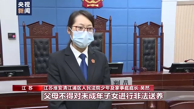 江苏省淮安市清江浦区人民法院少年及家事庭庭长吴然:经过我们审理查明,他们并没有到民政部门进行合法的收养登记。根据《中华人民共和国未成年人保护法》相关规定,父母不得对未成年子女进行非法送养,所以我们对两原告发出了首份家庭教育指导令。我们联合妇联部门,聘请专业的家庭教育指导师,对其二人进行了家庭教育指导,希望他们能在这次事件中吸取教训,也知晓法律的规定,在今后的过程中能够依法履行对未成年子女的监护职责。