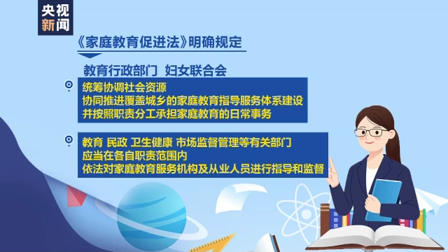 家庭教育促进法明确规定,教育行政部门、妇女联合会统筹协调社会资源,协同推进覆盖城乡的家庭教育指导服务体系建设,并按照职责分工承担家庭教育的日常事务;教育、民政、卫生健康、市场监督管理等有关部门应当在各自职责范围内,依法对家庭教育服务机构及从业人员进行指导和监督。