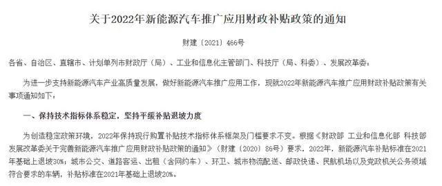 2022年1月1日,国内各大新能源车企纷纷发布2021年12月销量与2021年全年销量的同时,财政部、工业和信息化部、科技部以及发展改革委等四部委,也联合发布了《财政部工业和信息化部科技部发展改革委关于 2022 年新能源汽车推广应用财政补贴政策的通知》(此后简称“2022年政策通知”),明确了原则上每年补贴规模上限约200万辆,要平缓补贴退坡力度和节奏,2020-2022年补贴标准分别在上一年基础上退坡10%、20%、30%(2020年补贴标准见附件),即2022年的新能源汽车补贴标准是在2021年基础上退坡30%。