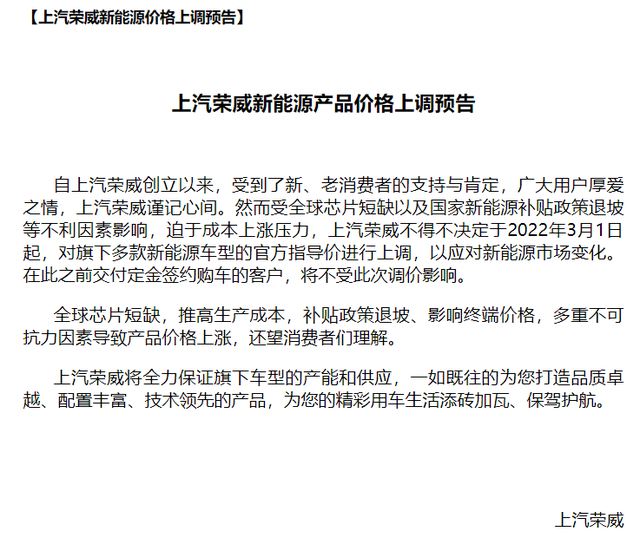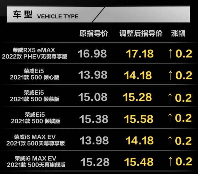 早在2月中旬就提前发布了涨价预告的上汽荣威,也在3月1日对旗下RX5 eMAX PHEV无畏尊享版、Ei5、i6MAX EV三款车型涨价,分别在原有价格上涨价2000元。