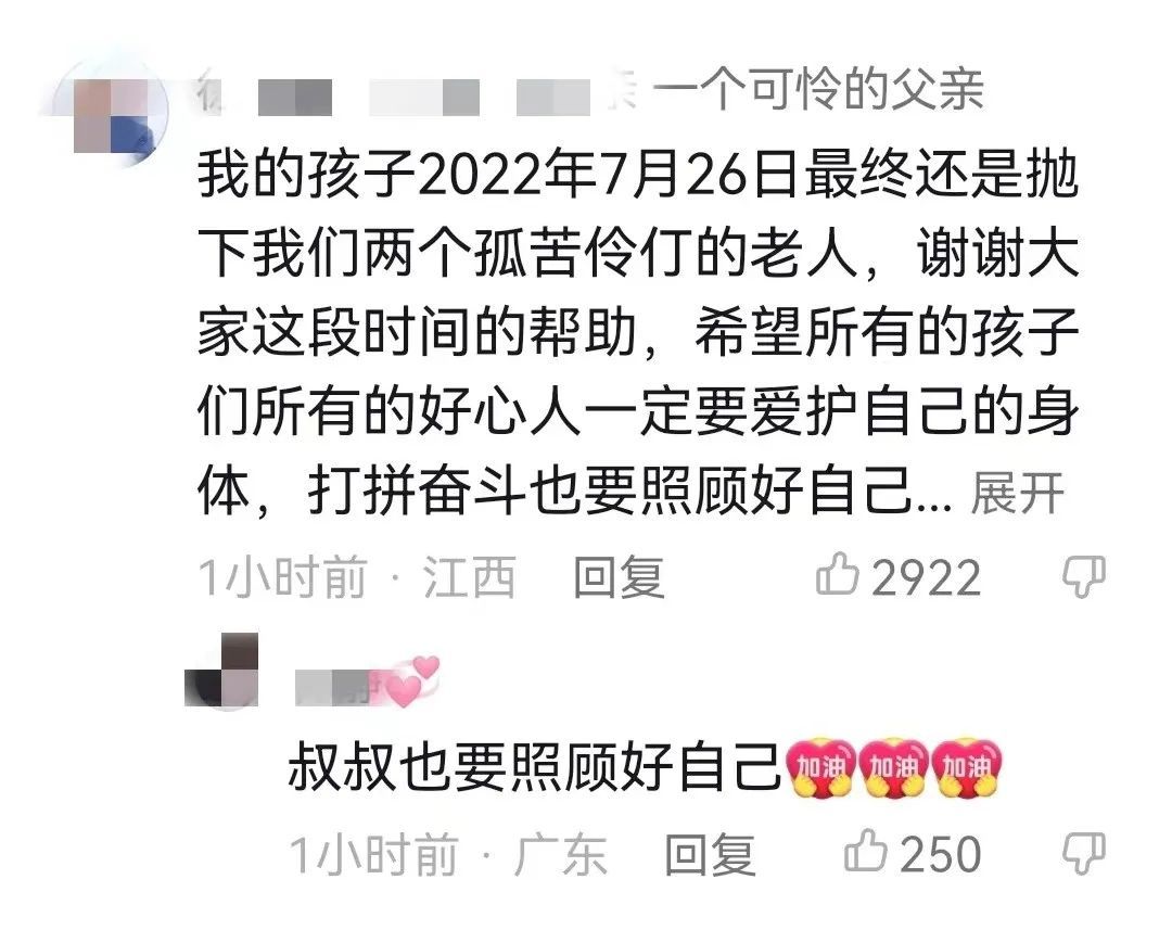 女孩父亲也在社交平台留言称:“我的孩子2022年7月26日最终还是抛下我们两个孤苦伶仃的老人,谢谢大家这段时间的帮助,希望所有的孩子们、所有的好心人一定要爱护自己的身体,打拼奋斗也要照顾好自己!”