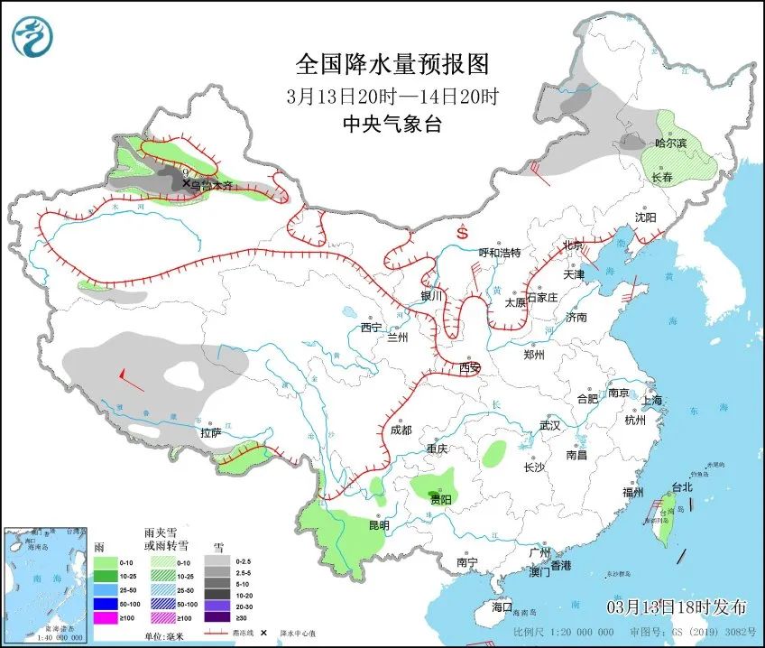 中央气象台预计,13日20时至14日20时,内蒙古东部、黑龙江南部、吉林西部、新疆沿天山地区和伊犁河谷等地部分地区有小到中雪或雨夹雪,其中,新疆沿天山地区等地部分地区有大雪。新疆沿天山地区和伊犁河谷、西藏中部和南部、云南西南部、贵州中部、台湾岛大部等地部分地区有小雨,其中,贵州中部等地部分地区有中雨。