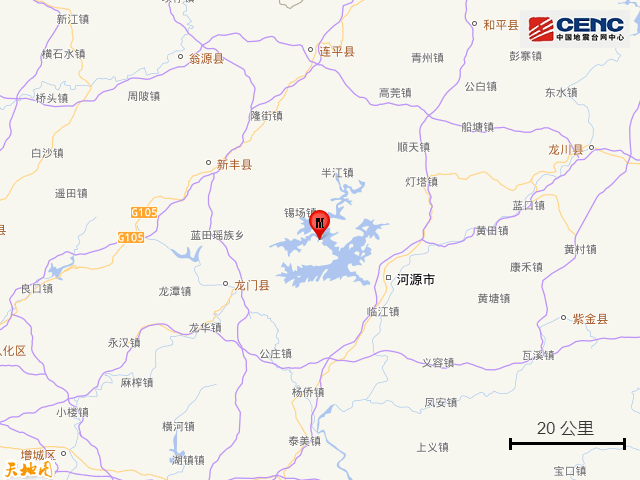 此前,7月3日20时57分在广东河源市东源县发生3.7级地震,震源深度9公里,震中位于北纬23.85度,东经114.50度。