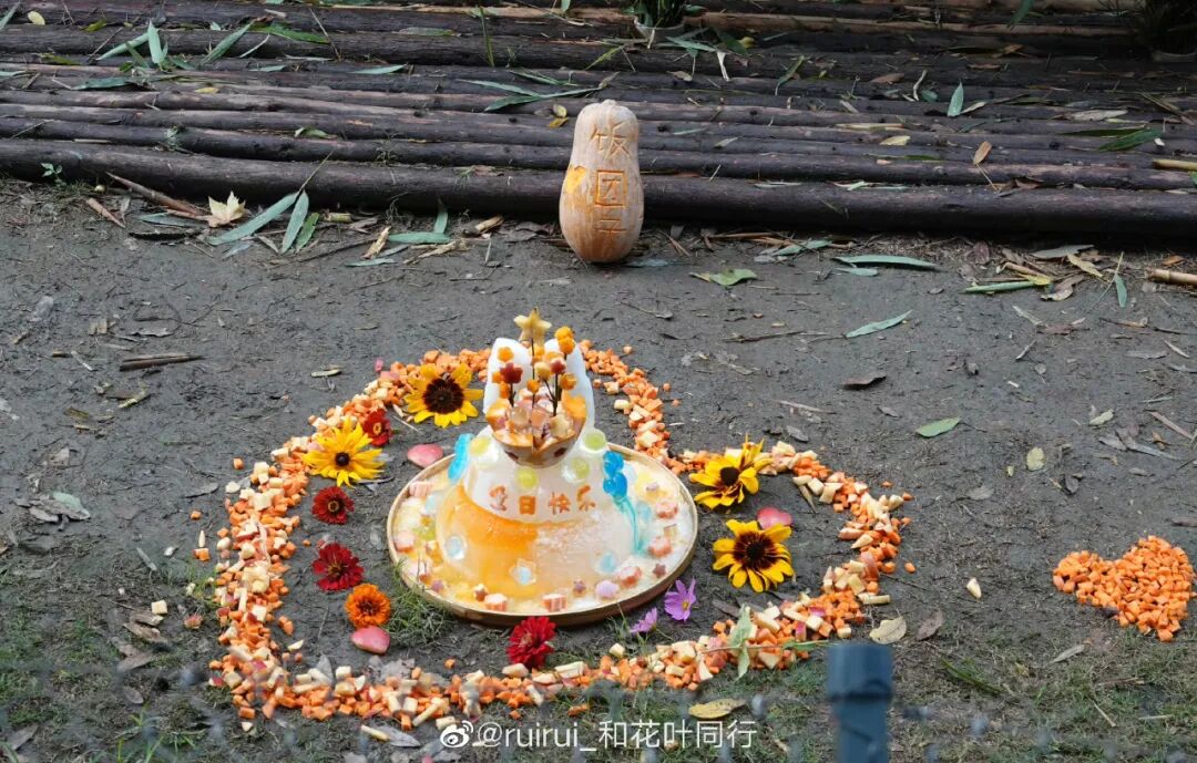 蛋糕的食æéžå¸¸ä¸°å¯Œä¸ä»…有胡èåœé›•刻出的“生日快ä¹â€å››ä¸ªå—还有“èŒå…°é€ åž‹â€çš„糕点底下还铺满了新鲜的竹å¶