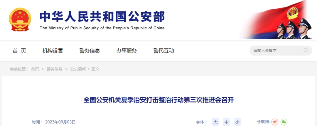 全国公安机关夏季治安打击整治行动第三次推进会8月31日召开,深入分析当前形势和存在问题,部署各地按照公安部党委要求,切实增强责任感紧迫感,迅速掀起夏季治安打击整治行动新一轮高潮,以决战姿态打好最后一个月冲刺战。