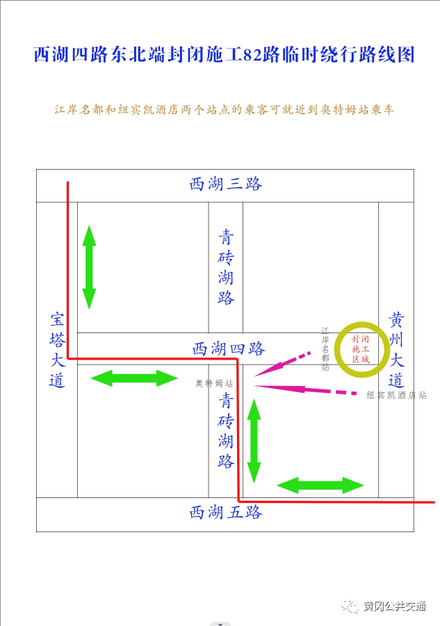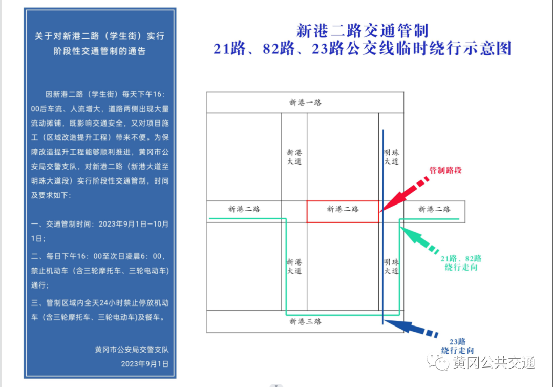 因黄州区新港二路(学生街)实行阶段性交通管制以及西湖四路和黄州大道交汇处封闭施工,公交21路、23路、82路采取临时绕行措施,道路管制和施工结束后将恢复原线路运行。望各位乘客相互转告,给您带来的不便敬请谅解。 来源:黄冈公交交通