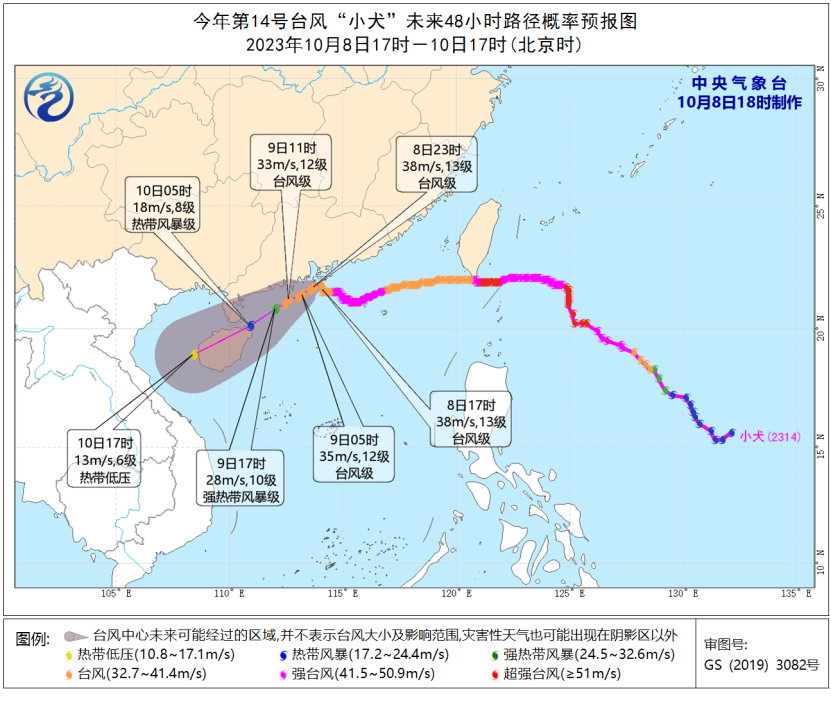 中央气象台8日18时继续发布台风黄色预警,今年第14号台风“小犬”的中心8日下午5时位于香港偏南方向大约90公里的南海北部海面上,预计,“小犬”将以每小时5公里左右的速度向偏北方向缓慢移动,将在珠江口近海转西偏南方向移动,然后向广东西部到海南岛东部一带沿海靠近,强度逐渐减弱。