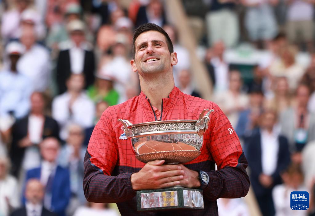 这是2023年6月11日,塞尔维亚选手诺瓦克·焦科维奇在2023年法国网球公开赛男子单打颁奖仪式上。 新华社记者 高静 摄