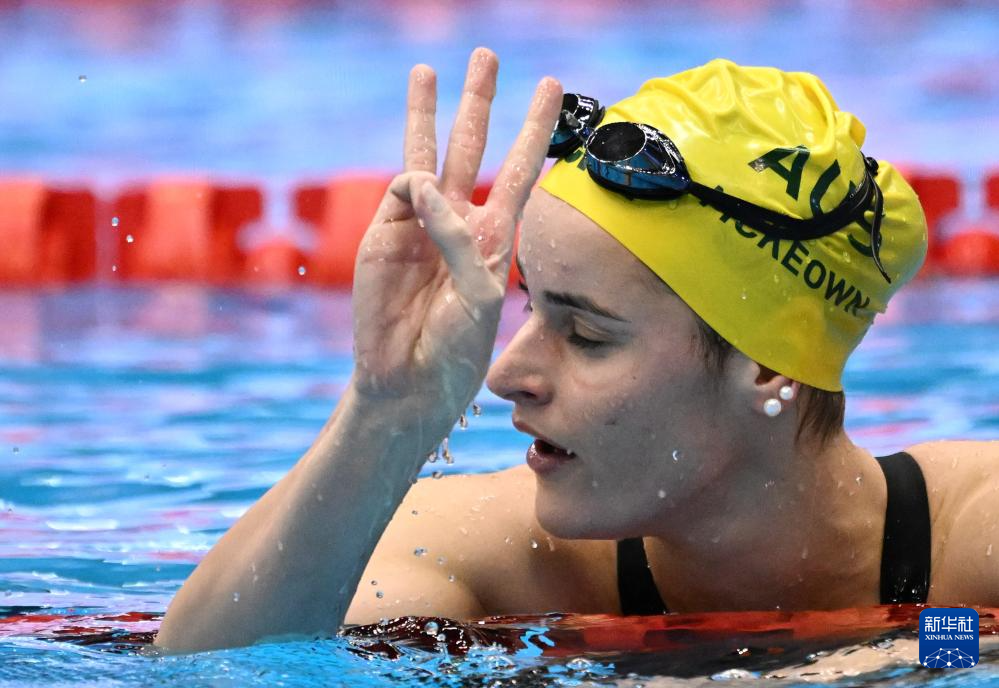 这是2023年7月29日,澳大利亚选手凯莉·麦基翁在福冈游泳世锦赛女子200米仰泳决赛后庆祝夺冠。 新华社记者 夏一方 摄
