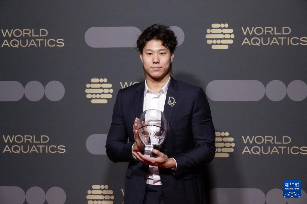 这是2023年10月23日,中国选手覃海洋在匈牙利布达佩斯获选2023年度世界泳联最佳男运动员。 新华社发(弗尔季·奥蒂洛摄)