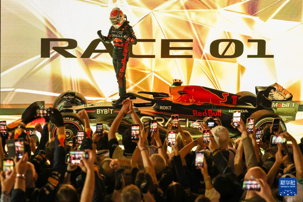 这是2023年3月5日,红牛车队荷兰车手马克斯·维斯塔潘在2023赛季世界一级方程式赛车锦标赛(F1)巴林大奖赛正赛后庆祝夺冠。 新华社发(钱俊摄)