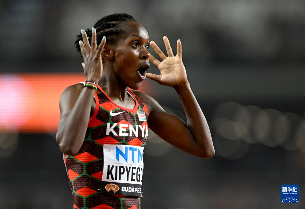 这是2023年8月22日,肯尼亚选手费丝·基普页真在2023世界田径锦标赛女子1500米决赛后庆祝夺冠。 新华社记者 宋彦桦 摄