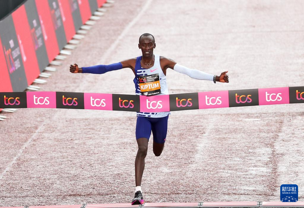 这是2023年4月23日,肯尼亚选手凯尔文·基普图姆在2023伦敦马拉松赛中冲过终点。 新华社记者 李颖 摄