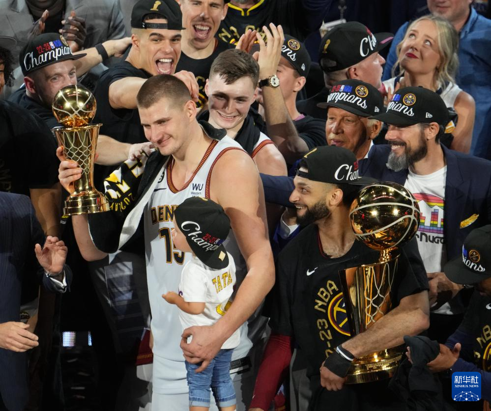 这是2023年6月12日,丹佛掘金队球员尼古拉·约基奇(前左)当选2022-2023赛季NBA总决赛最有价值球员。 新华社记者 吴晓凌 摄