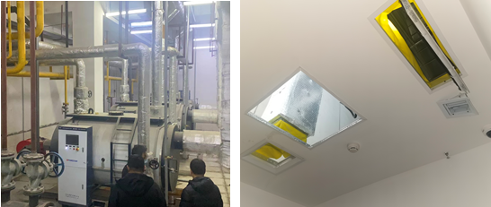 1号锅炉安装在一层西侧一房间内,2号锅炉安装在一层楼梯间内,使用天然气作为燃料。两台锅炉房均安装了推拉门,锅炉运行时推拉门处于关闭状态。两台锅炉的烟道及烟囱均为碳钢材质,锅炉烟气出口与管道连接处未进行焊接密封处理,采用直径0.2米的钢管直接套在锅炉烟气出口,接口处有明显缝隙。