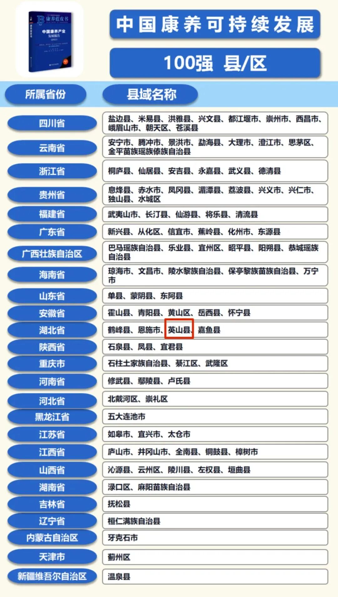 第六部《康养蓝皮书:中国康养产业发展报告(2023)》举行发布会,公布“2023年中国康养产业可持续发展能力百强县”名单,英山县成功入选中国康养可持续发展能力百强县。