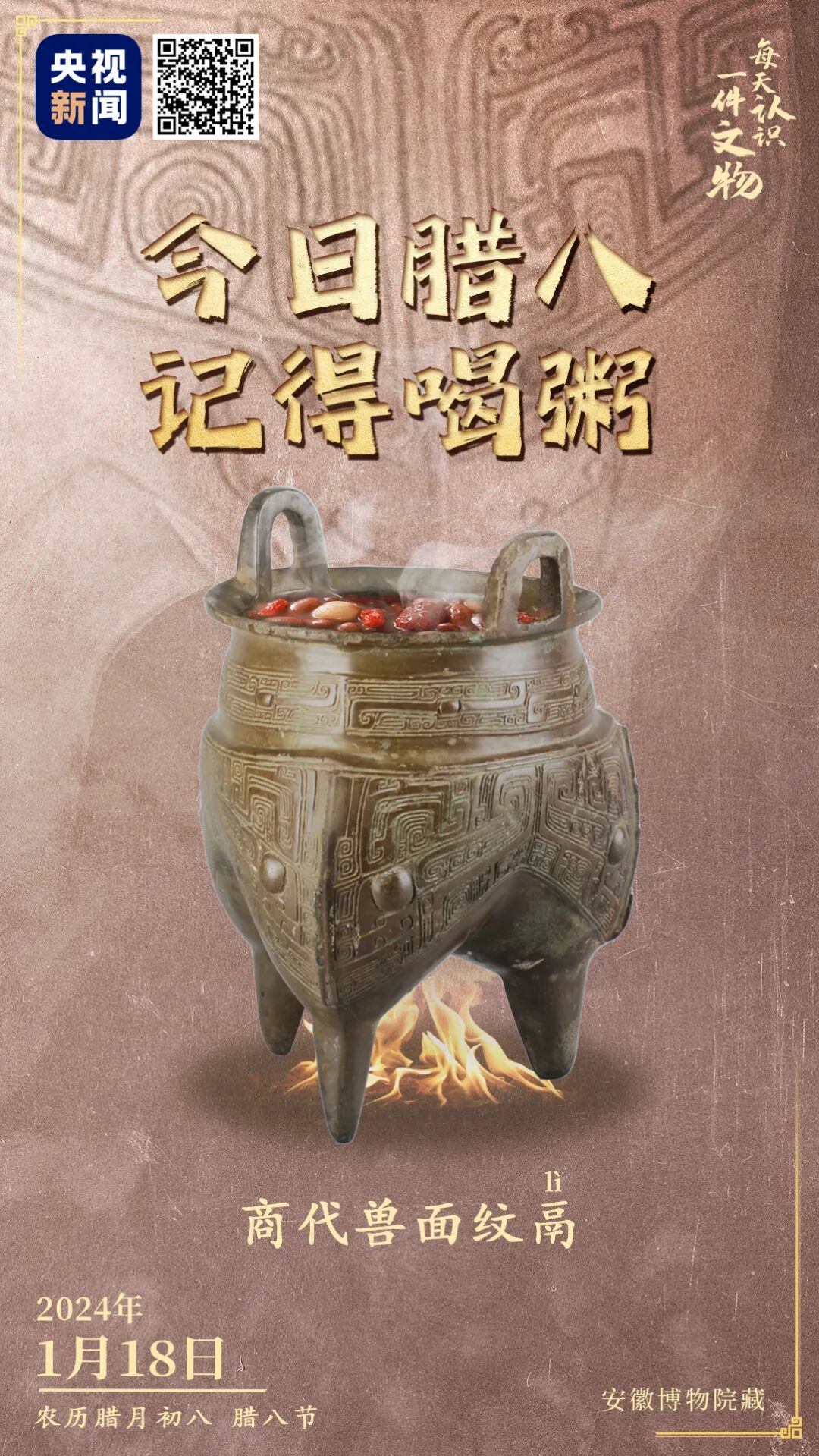 今天腊八,很多地方有喝腊八粥的习俗。几千年前的古人,怎么煮粥?这件商代兽面纹鬲(lì)就是古人烧水煮粥的器具。