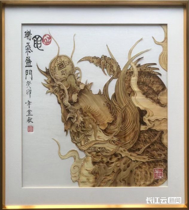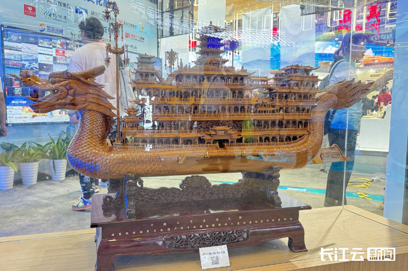 武汉木雕船模制作技艺是国家级非物质文化遗产项目,《中华巨龙》出自国家级非物质文化遗产项目国家级传承人 、中国工艺美术大师龙从发之手。该作品在长1.6米、宽0.38米、高1.05米的龙船上,雕刻有古琴台、黄鹤楼、晴川阁、归元寺等武汉八大景点。“古琴台”上,俞伯牙抚琴,钟子期侧耳聆听。“行吟阁”中,爱国诗人屈原吟诗作赋,官员、仕女等70余个人物穿插其间,栩栩如生。此外,楼阁、花窗、格门、云栏等花纹精雕细刻,清晰细腻,船尾彩旗飘扬,仿佛一条巨龙扬帆破浪而来,充分展现出船模雕刻技艺的华丽浪漫。