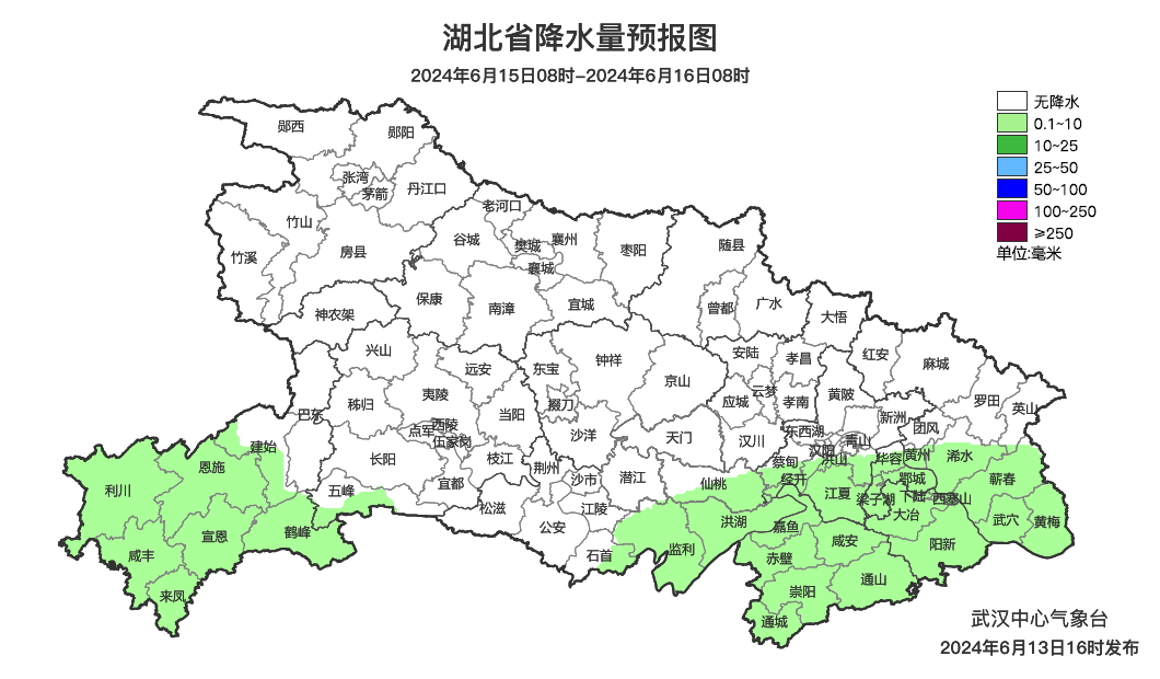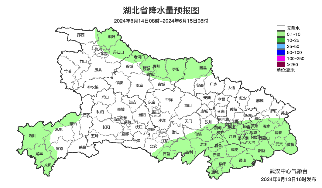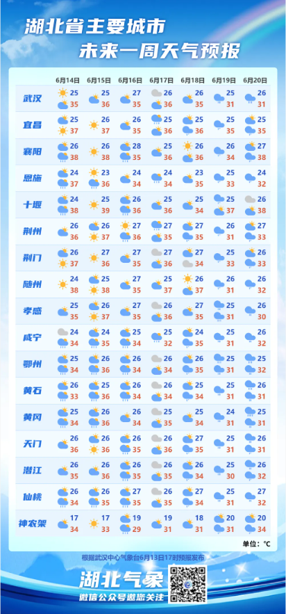 夏日炎炎大家都期待着一场雨水来降降温然而根据最新预报6月17日之前我省大部地区仍以多云间晴天气为主局部有分散性阵雨或雷阵雨高温、闷热仍是我省主旋律大家午后尽量减少户外活动做好防暑降温措施还要提醒大家的是夏季午后强对流天气多发公众需留意临近预报预警信息加强防范未来三天全省天气预报6月14日08时-15日08时,全省多云,其中鄂西北、鄂西南、江汉平原南部、鄂东南有分散性阵雨或雷阵雨,局地有雷暴大风等强对流天气。最高气温鄂东南31~34℃、其他地区34~38℃,最低气温22~26℃,偏南风2到3级。