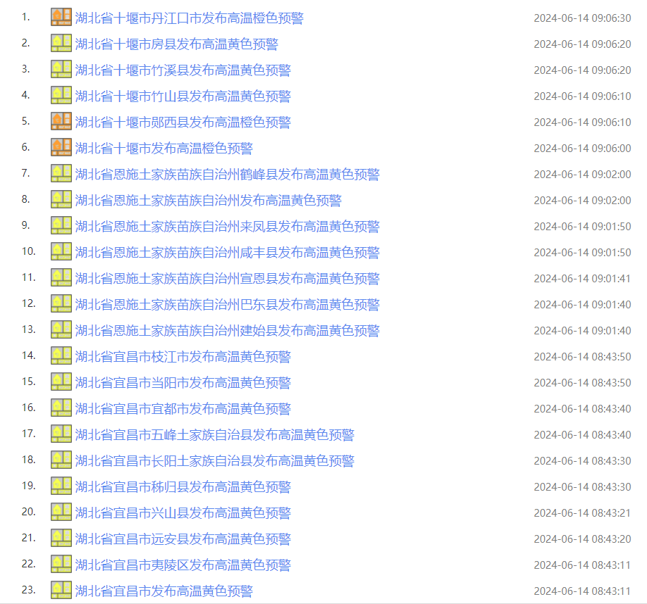 十堰市气象台2024年06月14日09时05分发布高温橙色预警信号:预计今天14至17时,十堰北部最高气温将达37℃以上,南部35℃以上,请注意防范。
