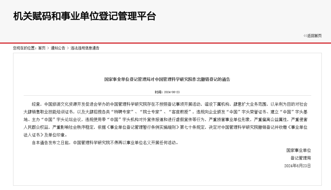 国家事业单位登记管理局发布通告,对中国管理科学研究院作出撤销登记。通告全文如下:经查,中国旅游文化资源开发促进会举办的中国管理科学研究院存在不按照登记事项开展活动,滥设下属机构,肆意扩大业务范围,以牟利为目的对社会大肆销售职业技能培训证书,以及大肆招揽各类“特聘专家”、“院士专家”、“客座教授”,违规向企业颁发“中国”字头荣誉证书、建立“中国”字头基地、主办“中国”字头论坛会议,违规使用带“中国”字头机构对外宣传报道和进行虚假宣传等行为,严重损害事业单位形象,严重偏离公益属性,严重侵害人民群众权益,严重影响社会秩序稳定,依据《事业单位登记管理暂行条例实施细则》第七十条规定,决定对中国管理科学研究院撤销登记并收缴《事业单位法人证书》及单位印章。自本通告发布之日起,中国管理科学研究院不得再以事业单位名义开展任何活动。