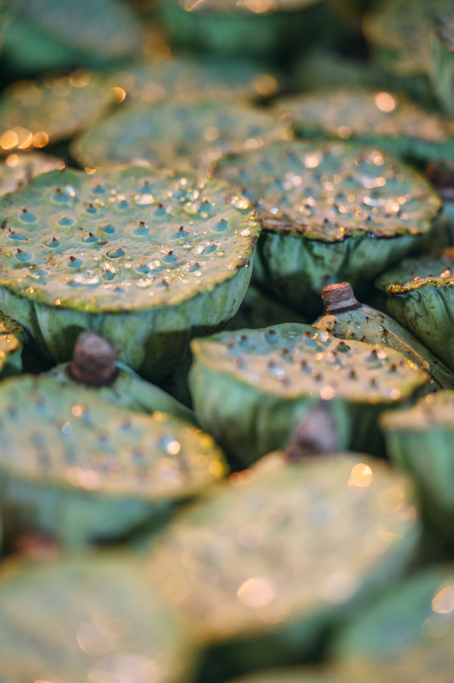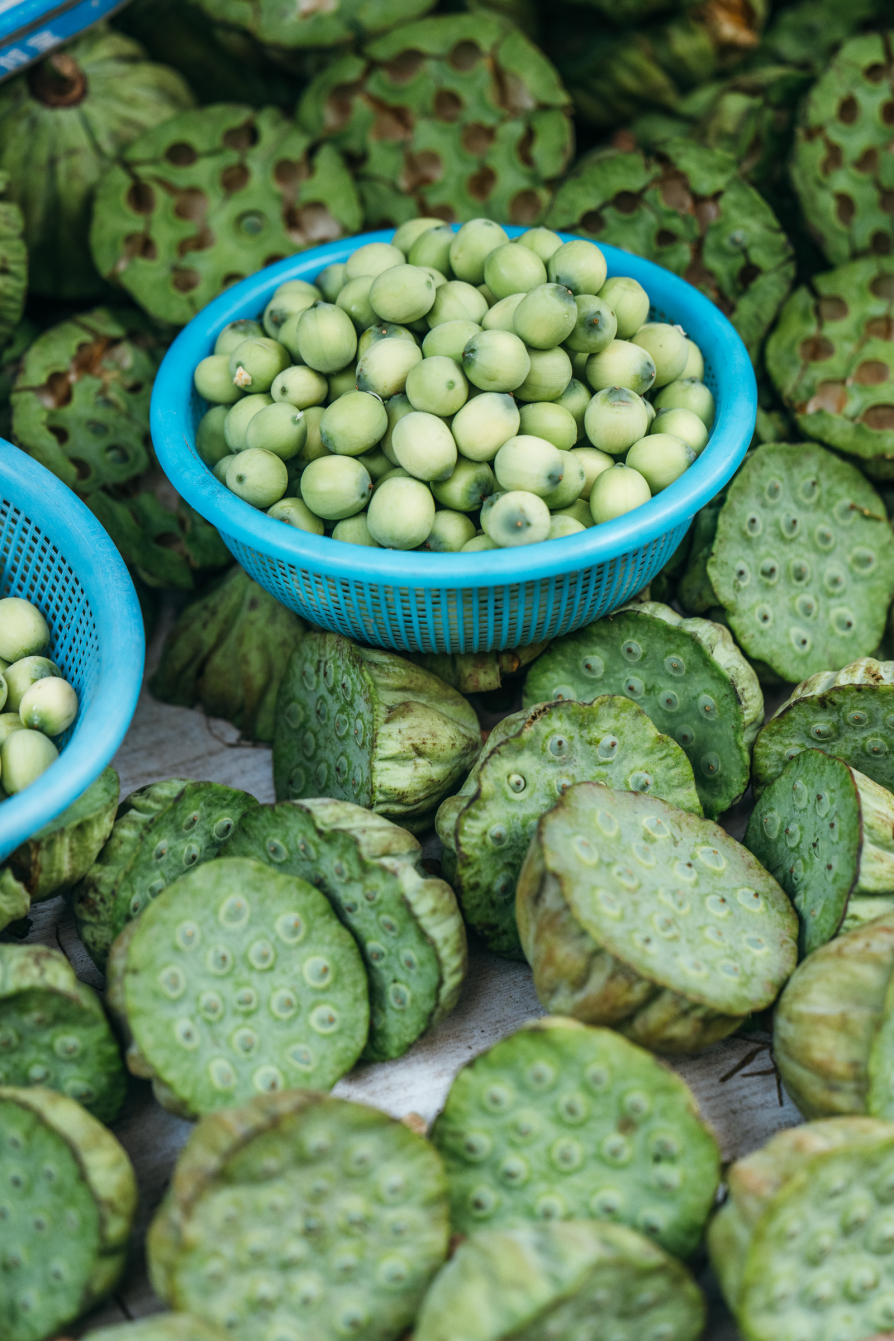 从海绵体里拿出莲子,剥掉油绿的果皮