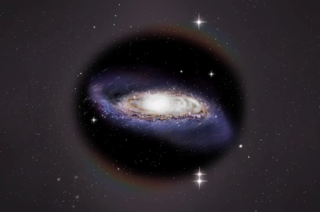 银盘翘曲在银河系暗物质晕的力矩下“翩翩起舞(进动)”的艺术想象图(上海交通大学设计学院侯开元、董占勋制作)。