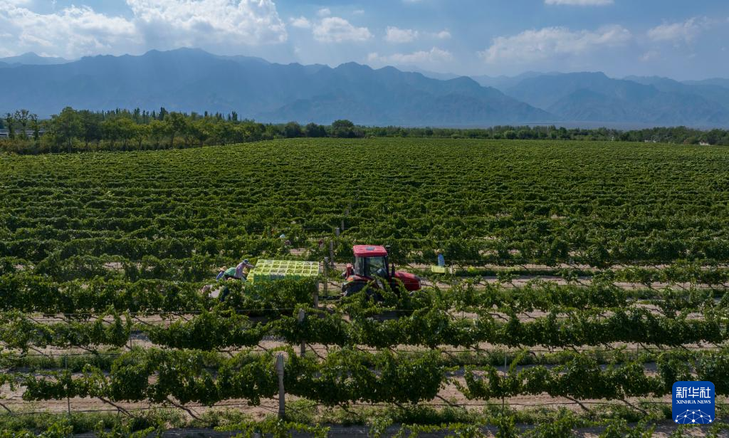 8月12日,采摘工在位于贺兰山东麓银川市西夏区的志辉源石酒庄采收酿酒葡萄(无人机照片)。 近日,宁夏贺兰山东麓葡萄酒产区迎来酿酒白葡萄采摘季,工人们紧抓农时,在葡萄园里采摘霞多丽白葡萄,田间地头一片繁忙的景象。 新华社记者 杨植森 摄