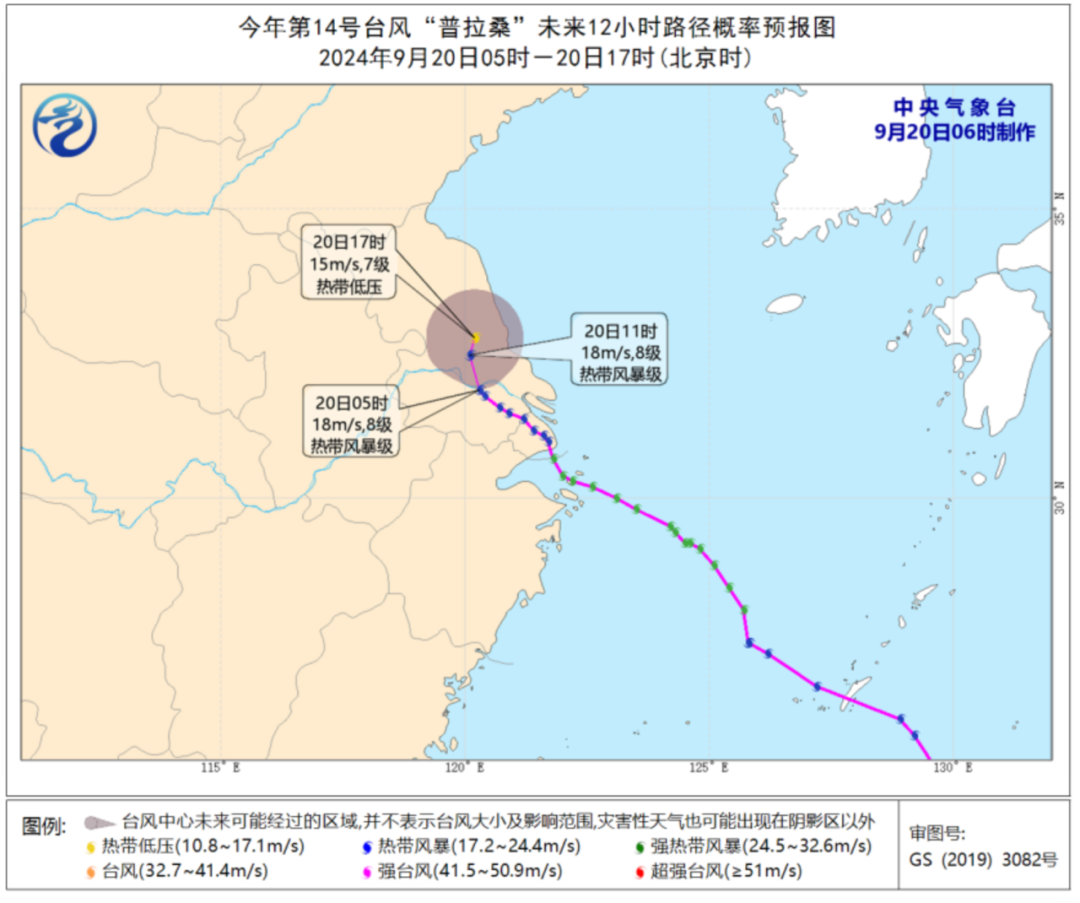 中央气象台20日6时发布台风蓝色预警:今年第14号台风“普拉桑”的中心已于19日傍晚6点50分前后在浙江省舟山市岱山县沿海登陆,穿过杭州湾后于晚上9点45分前后在上海市奉贤区沿海二次登陆(热带风暴级)。今天(20日)凌晨,其中心由上海市移入江苏省昆山市境内,早晨5点钟位于江苏省江阴市境内。