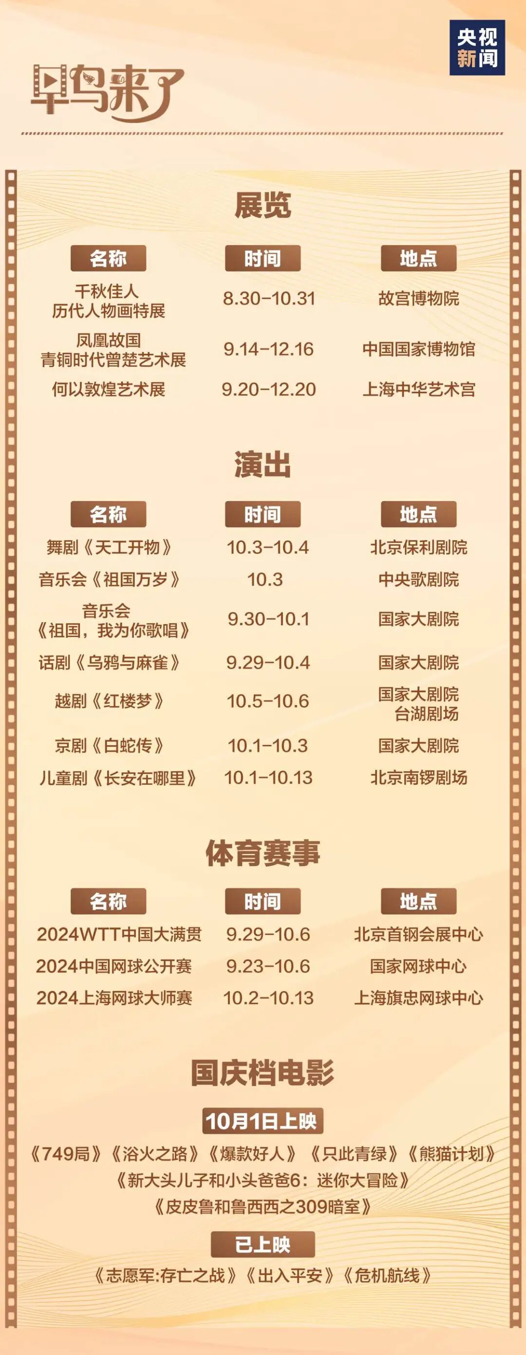 十一假期你准备去哪儿玩?如果不想在景点“人从众”,出门看电影、演出、展览也是不错的选择。目前,《爆款好人》《749局》《熊猫计划》等多部影片集体上映。此外,还可以在北京看话剧《乌鸦与麻雀》,在上海看“何以敦煌”艺术展,或是去赛场一睹球员风采……总有一款适合你!