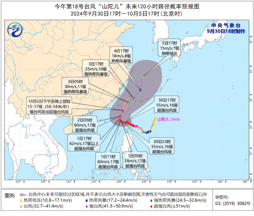 中央气象台9月30日18时发布台风橙色预警,预计今年第18号台风“山陀儿”将于10月2日下午至晚上以超强台风级登陆台湾岛西南部沿海。