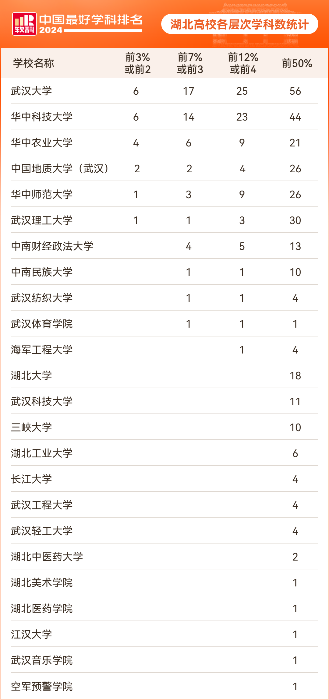 除了顶尖学科和冠军学科,湖北还拥有前7%或前3名学科50个,前12%或前4名学科82个。湖北高校的学科整体表现,以及优势学科的发展,都彰显了卓越的实力和竞争力。