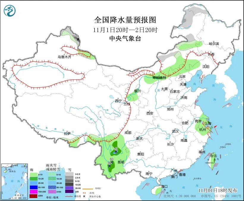 中央气象台预计,11月1日20时至2日20时,内蒙古中东部、黑龙江西北部、新疆北疆北部和东部、川西高原南部等地部分地区有小雪或雨夹雪,其中,新疆北部局地有中到大雪。内蒙古中南部、宁夏西北部、河北北部、北京北部、江苏东南部、上海、浙江北部、四川南部、云南中西部、台湾岛中东部、海南岛东南部等地部分地区有小到中雨,其中,四川南部、云南中部部分地区有大雨。
