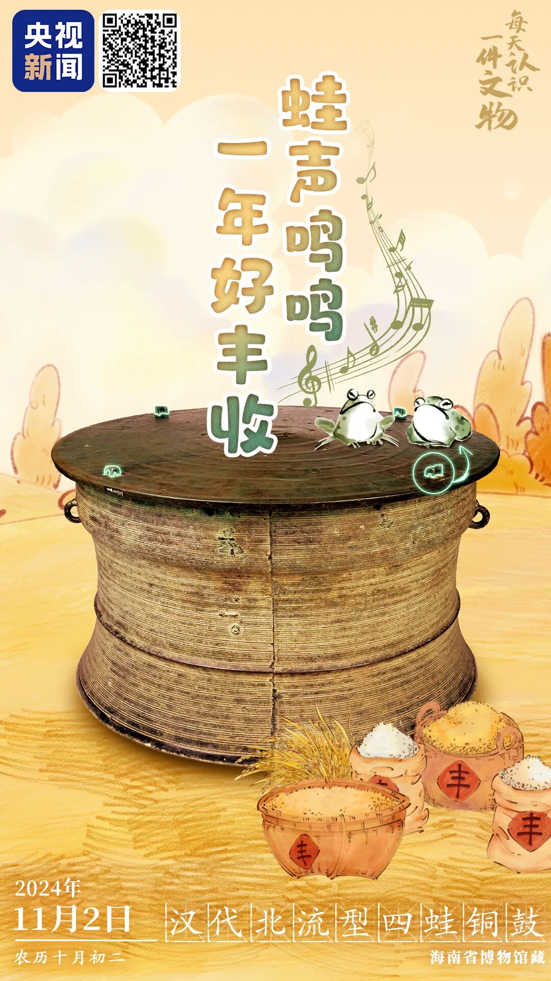 央视新闻联合全国博物馆推出文博科普产品《文博日历》,每天带你认识一件文物。北流型铜⿎是铜⿎⼋⼤类型之⼀,流⾏于汉代到唐代。这面藏于海南省博物馆的汉代北流型四蛙铜⿎,⿎⾯约100厘⽶,可躺下⼀个3岁⼩孩。⿎边缘有垂檐,⿎⾯正中铸⼋芒太阳纹,边缘铸有四只⽴蛙,铸造精良,形状规整,极富特⾊,体现了古⼈对蛙图腾的崇拜。