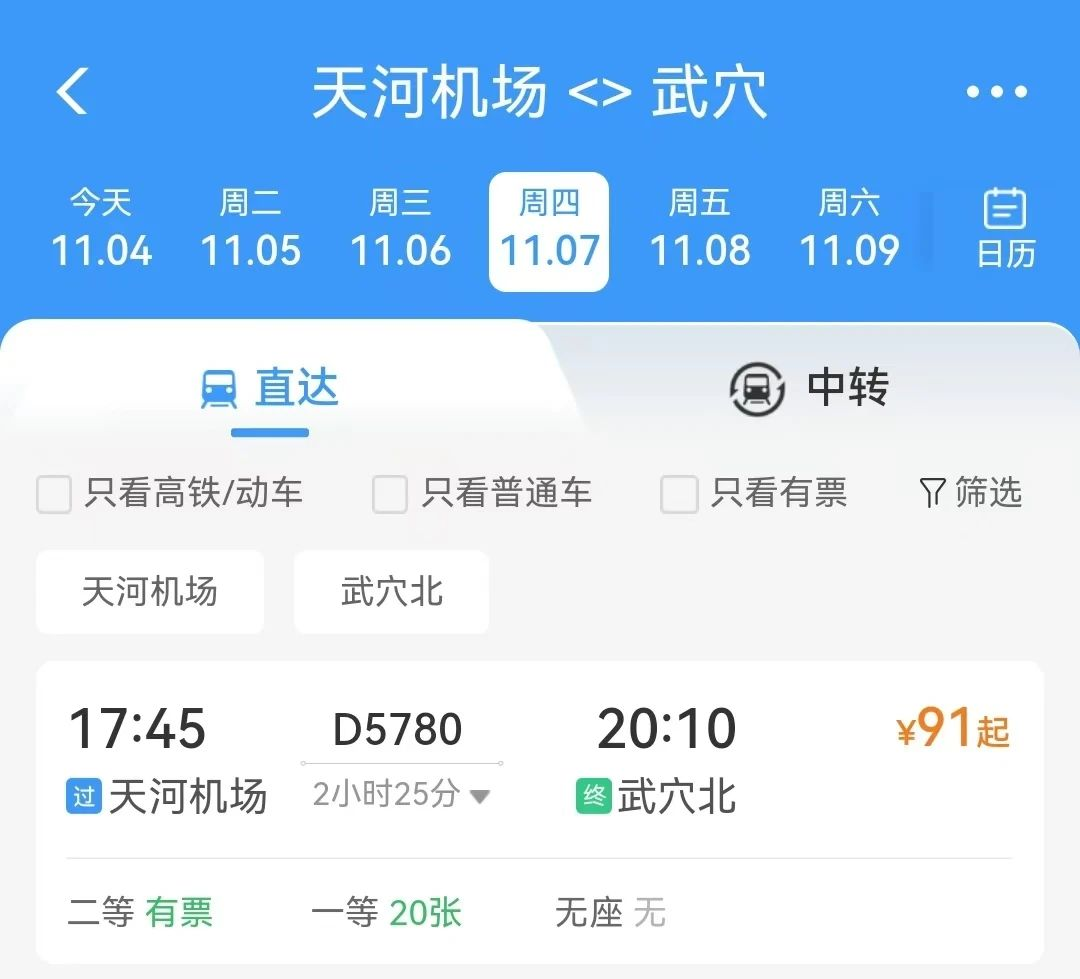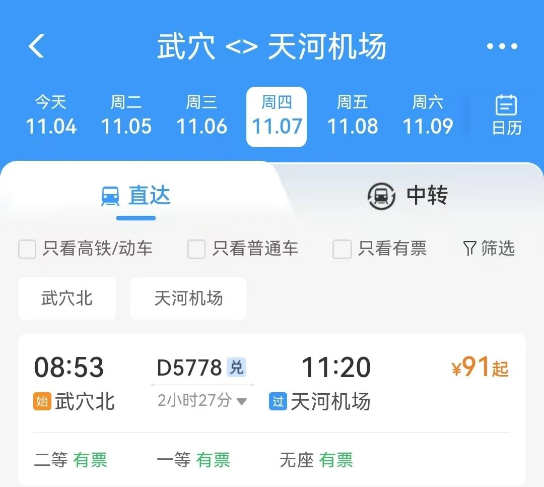 12306查询结果显示,自11月7日(周四)开始武穴北-天河机场每日将开通一趟往返班次分别为D5778(武穴北→天河机场 08:53→11:20);D5780(天河机场→武穴北 17:45→20:10)。