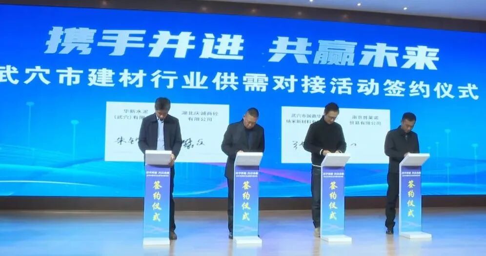11月21日,武穴市举办“携手并进·共赢未来”绿色建材行业供需对接活动,通过为企业跑订单、服务企业发展,加强企业合作、释放更大产能,推动该市绿色建材产业高质量发展。活动现场,华新水泥(武穴)有限公司与湖北庆诚商砼有限公司等10家企业现场签订了供需合同。