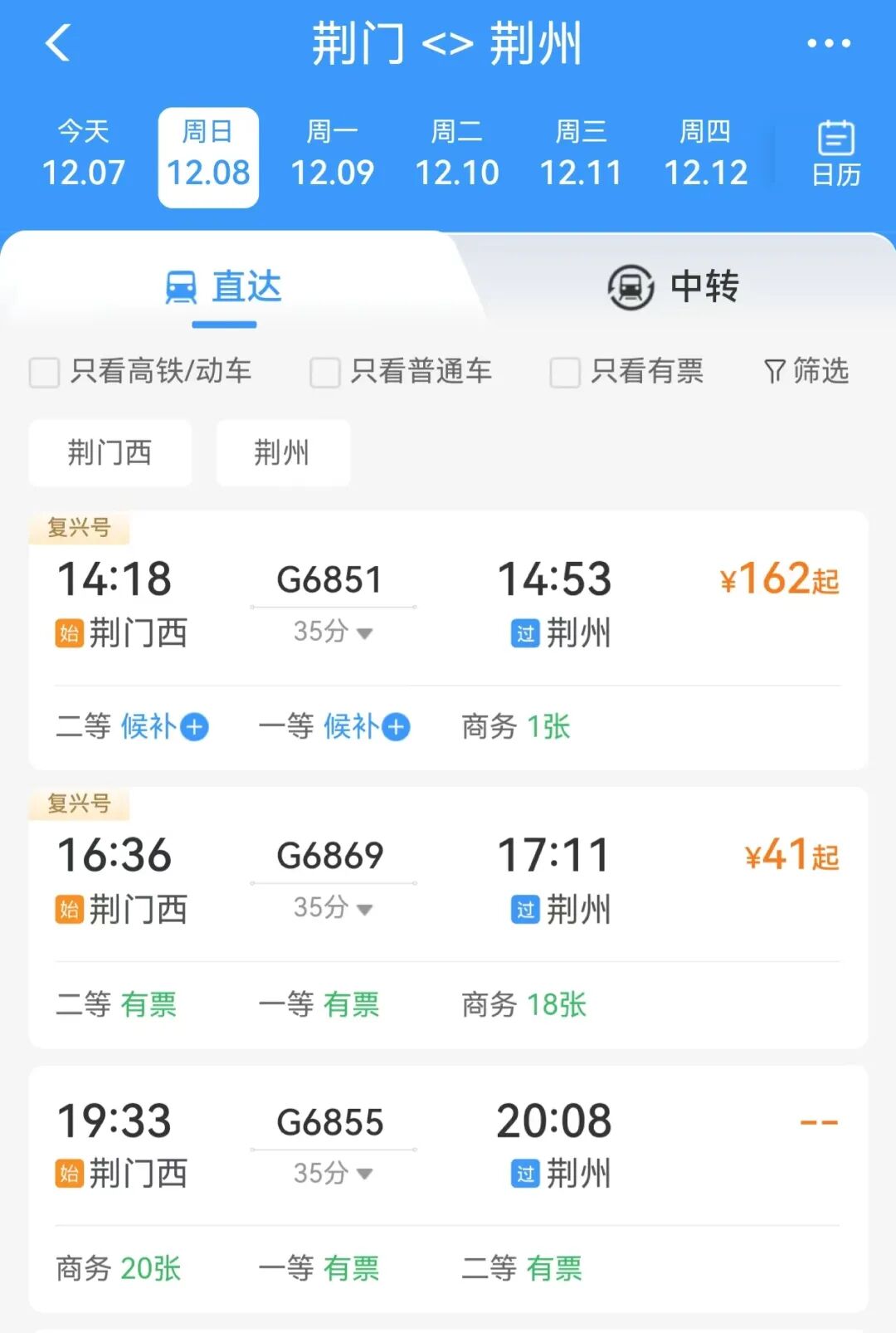 记者从铁路12306获悉,荆荆高铁火车票已经开始发售。根据售票信息显示,荆门西站至汉口站最快为1小时33分,荆门西站至荆州站最快为35分钟。