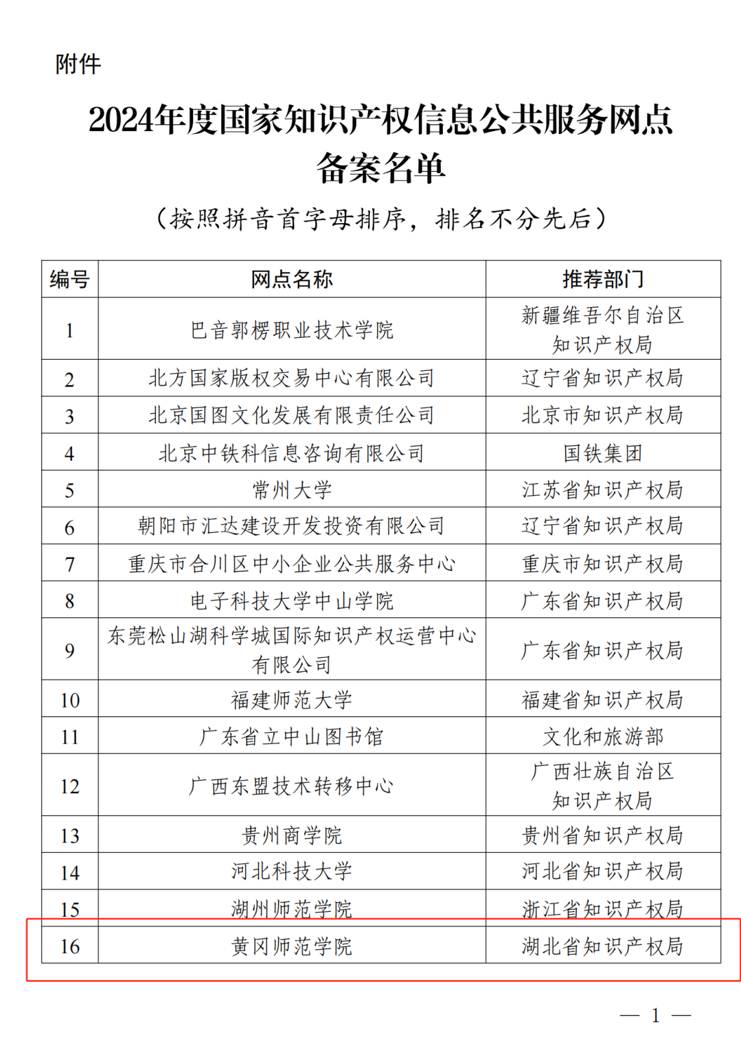 日前,记者从国家知识产权局官网获悉,国家知识产权局办公室近日公布2024年度国家知识产权信息公共服务网点名单,黄冈师范学院成为本年度全国36家之一、湖北省唯一入选国家级服务网点的机构。