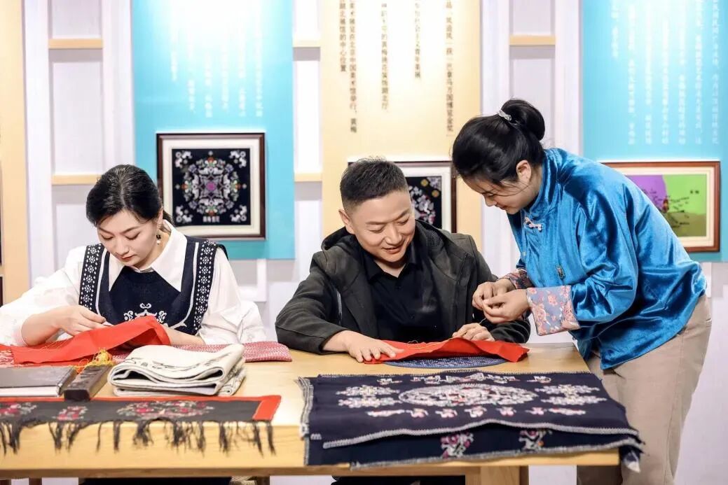 在非遗挑花体验中,黄梅戏名家何云和徽剧名家汪育殊细致入微,一针一线都承载着对传统文化的敬畏与传承。