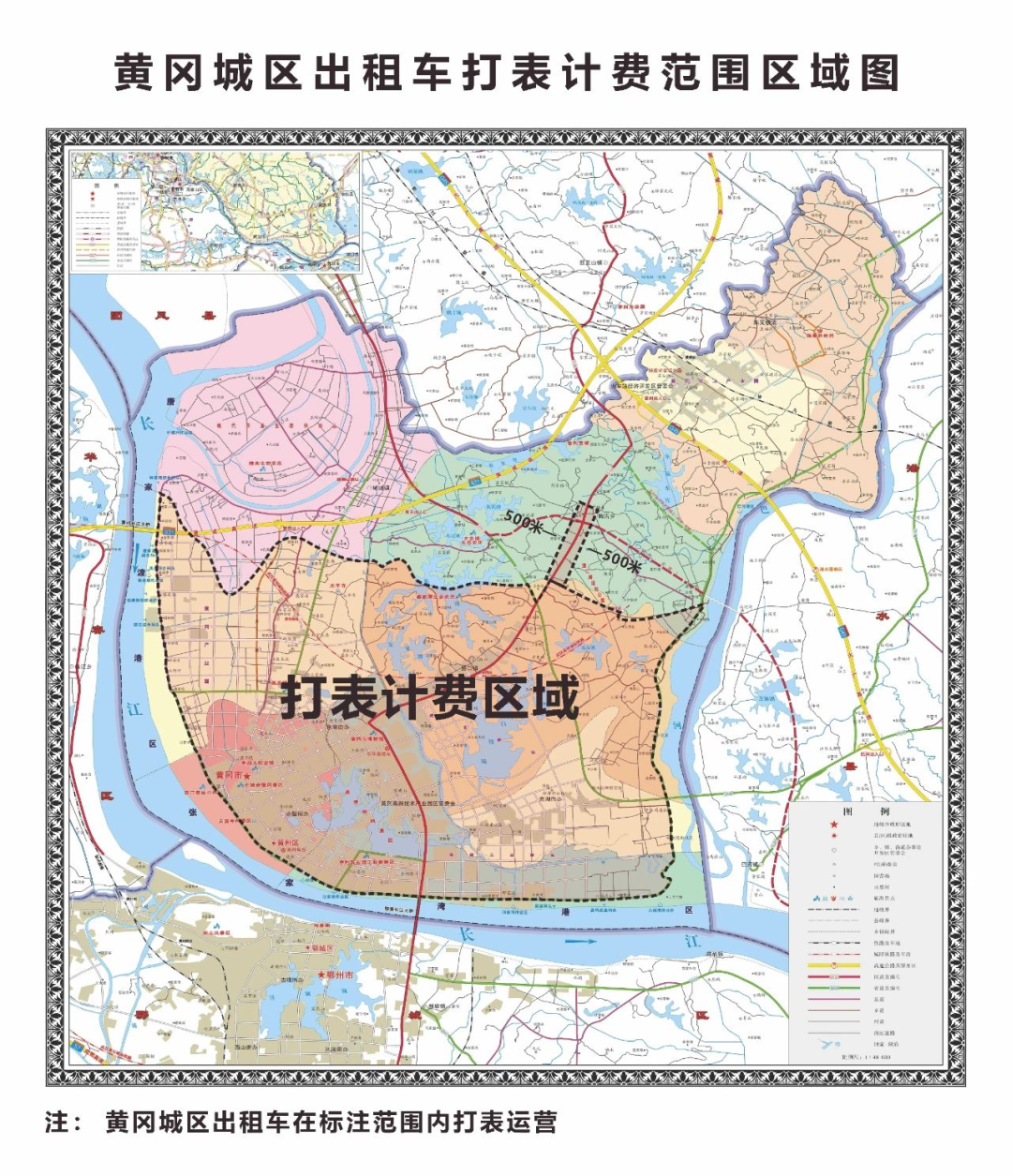 一、中心城区东侧沿城东公路、沿江线向西区域;西侧沿沿江大道向东(黄冈产业园全部区域);南侧沿沿江路以北区域;北侧以路口镇与陶店乡行政区划为界,至江北路、刘子通路、定香路以南区域。另,以陶店乡集镇为界沿106国道两侧500米内打表计费。