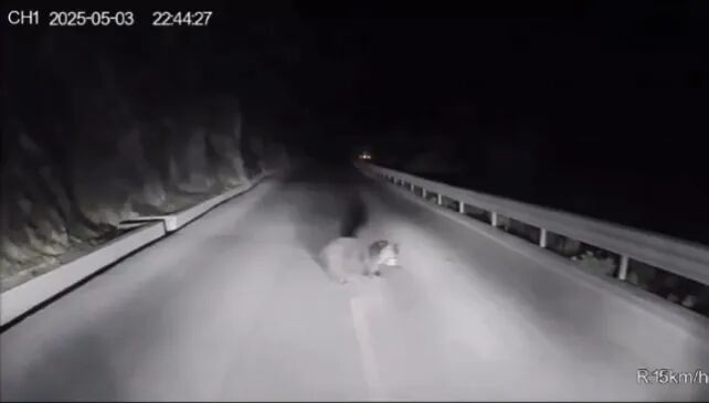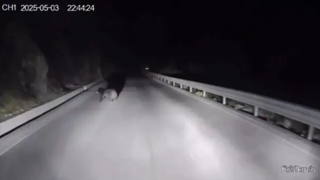 5月3日晚10点44分,兴山县水月寺镇安桥河村村民舒开云下班开车回家,在夜间的公路上偶遇黑熊。行车记录仪视频显示,当晚,道路上夜色昏暗,只有车灯泛起点点灯光,一个魁梧的黑影突然从路边窜出。舒开云立马减缓车辆行驶速度,才看清那个黑影竟是一只黑熊。