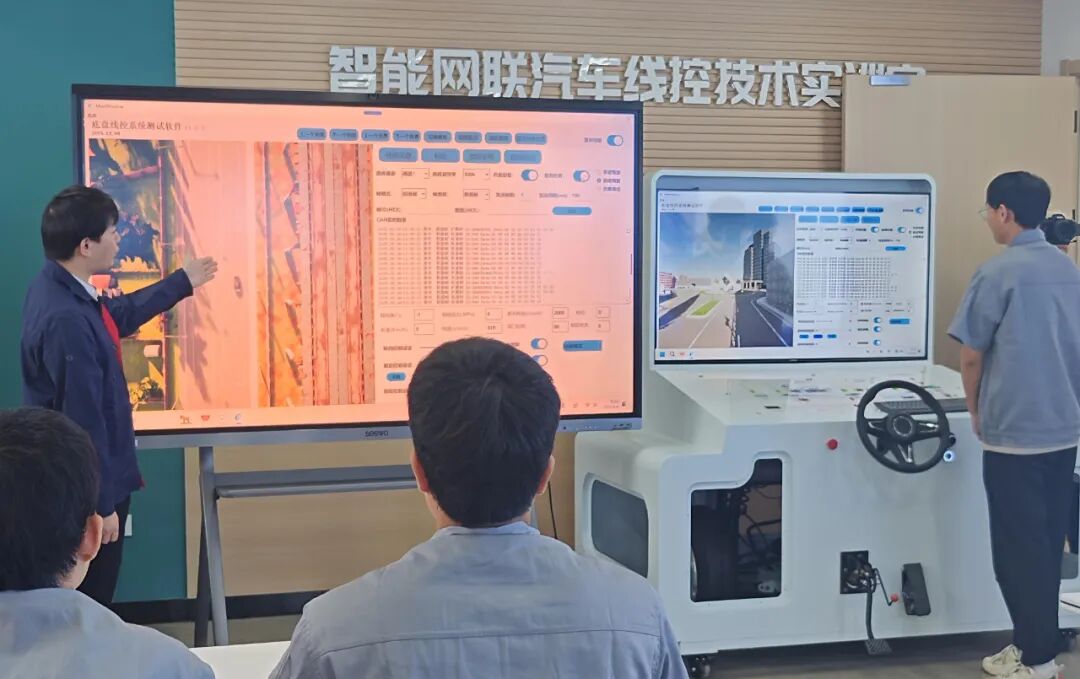 武汉软件工程职业学院智联网汽车产业学院演示虚拟仿真数字技术助力智能网联汽车教学。(湖北日报全媒记者 李玉麟 摄)