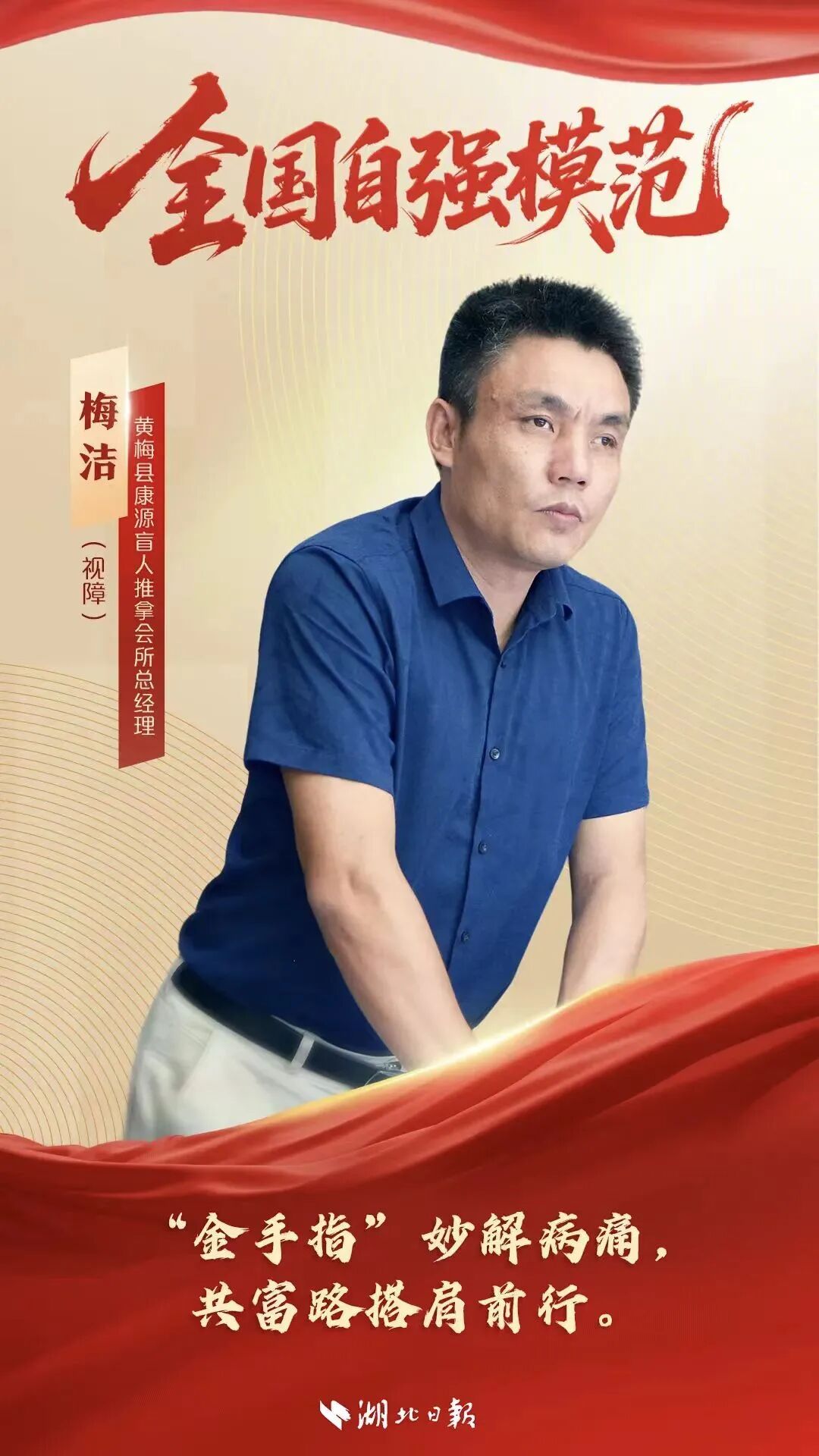 1976年,梅洁出生于黄梅县新开镇的一个普通农家。15岁时,视神经病变让他坠入黑暗。在绝望的深渊中,收音机里“盲人可以通过按摩重新定义人生”的话语如破晓之光,为他照亮希望之路。1996年,他来到江西盲人按摩学校,开启“以指为眼”的逐梦之旅。看不见经络穴位,就用手指一寸寸丈量记忆,指尖磨破出血仍反复练习,他用千万次摸索练就“金手指”技艺。3年后,他以优异成绩拿下高级按摩师职称与医疗按摩资格证书,完成从失明少年到专业技师的蜕变。