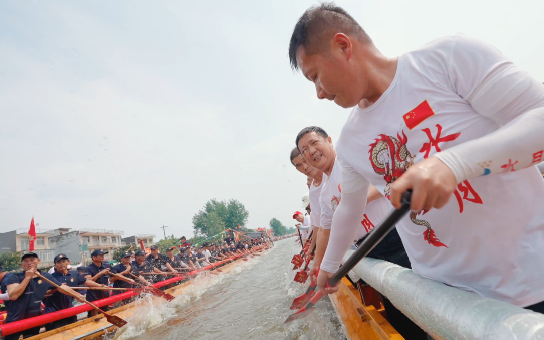 当天上午,东港、西河河道上,59艘龙船如蛟龙出水,桨手们齐声呼号,齐刷刷以站姿挥桨劈浪,激起千层白练,在浪尖上划出一道道奔腾的弧线。