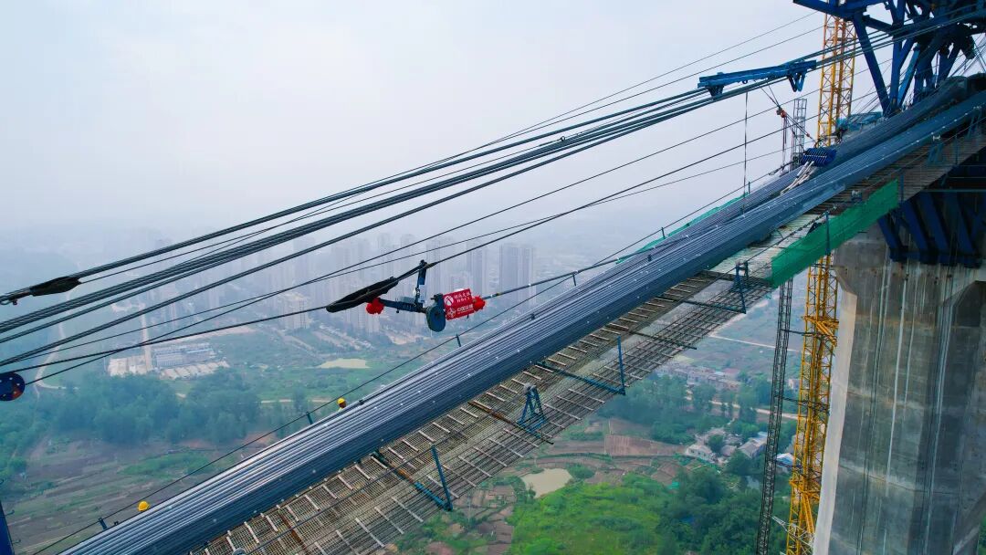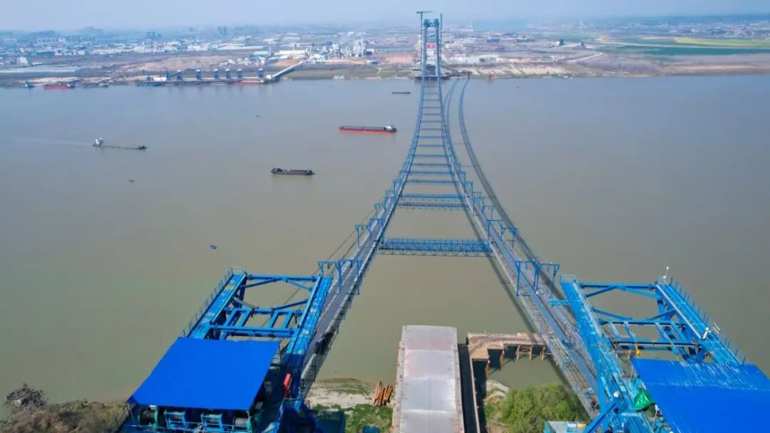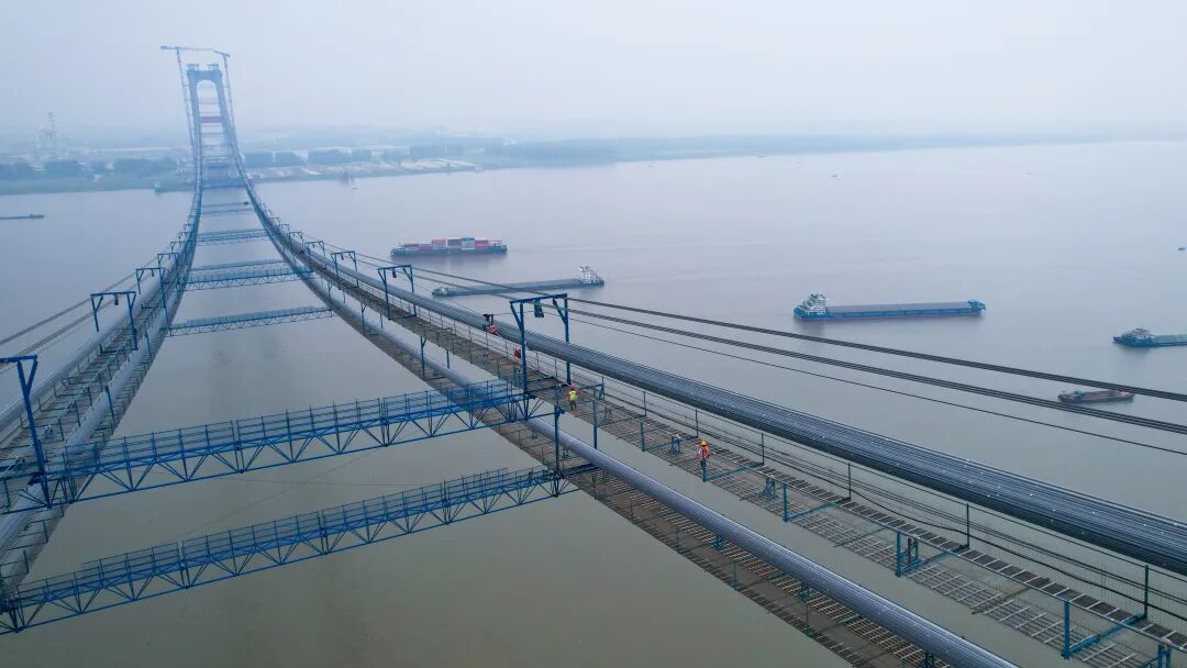 主缆是悬索桥最关键的受力部件,被称为大桥悬空的“生命线”。燕矶长江大桥采用一跨过江的方式,因受长江通航需要和花湖机场航空限高影响,具有跨径大、载荷大、垂跨比小的特点。为解决结构难题,大桥采用世界首创不同垂度四主缆双层悬索桥结构体系,其同侧主缆高度、长度、垂度均不同,以此分散荷载,提高桥梁的稳定性,并且优化了索鞍及主缆规模,使主缆受力更加合理。