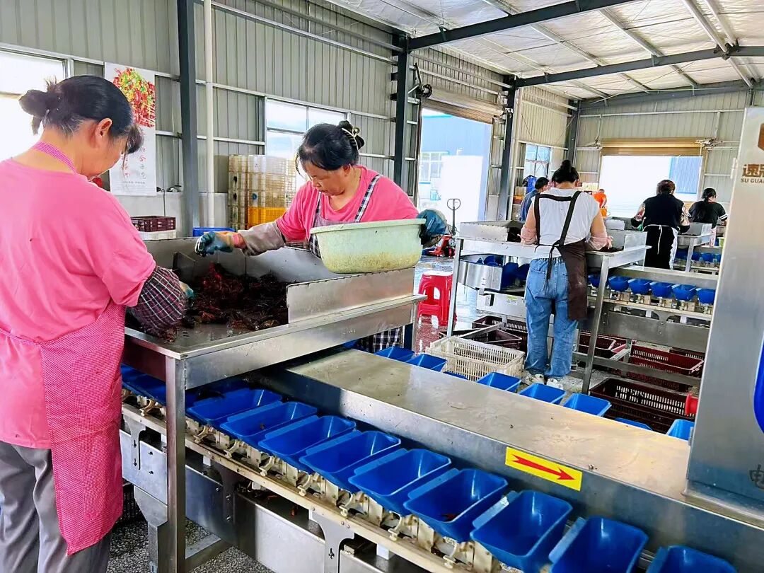 在鑫鸿业水产养殖销售一体化项目车间里,收购线、储虾机、气泡清洗机、全自动蒸煮机、温水冰水冷却机、隧道式速冻机等自动化设备有序运转,全自动小龙虾加工生产线更是大幅提升了生产效率。张宝青介绍道:“这些先进设备,让我们的生产效率比传统模式提高了数倍!”