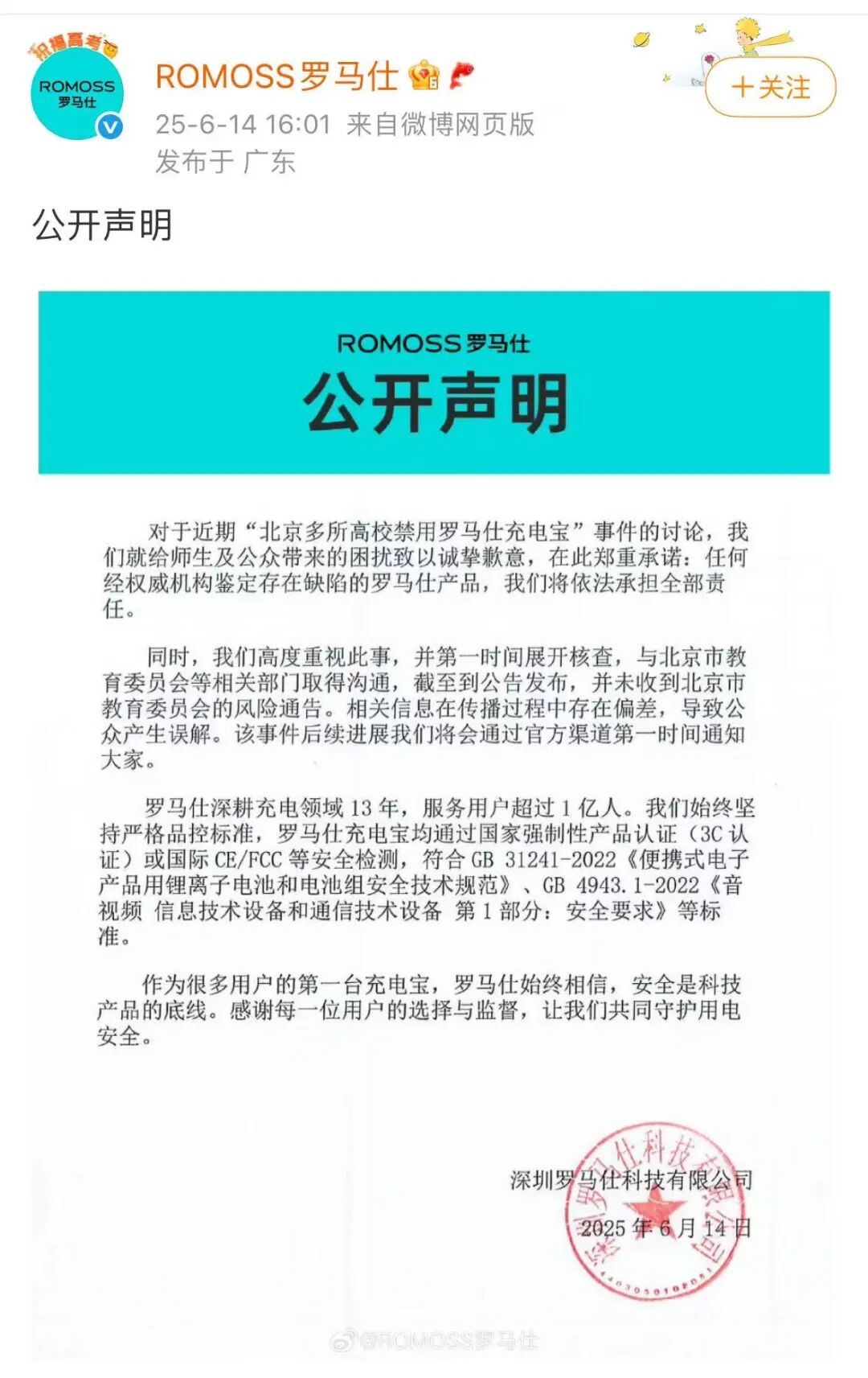 涉事品牌方声明表示,对于近期“北京多所高校禁用罗马仕充电宝”事件的讨论,其就给师生及公众带来的困扰致以诚挚歉意,并承诺任何经权威机构鉴定存在缺陷的罗马仕产品,将依法承担全部责任。